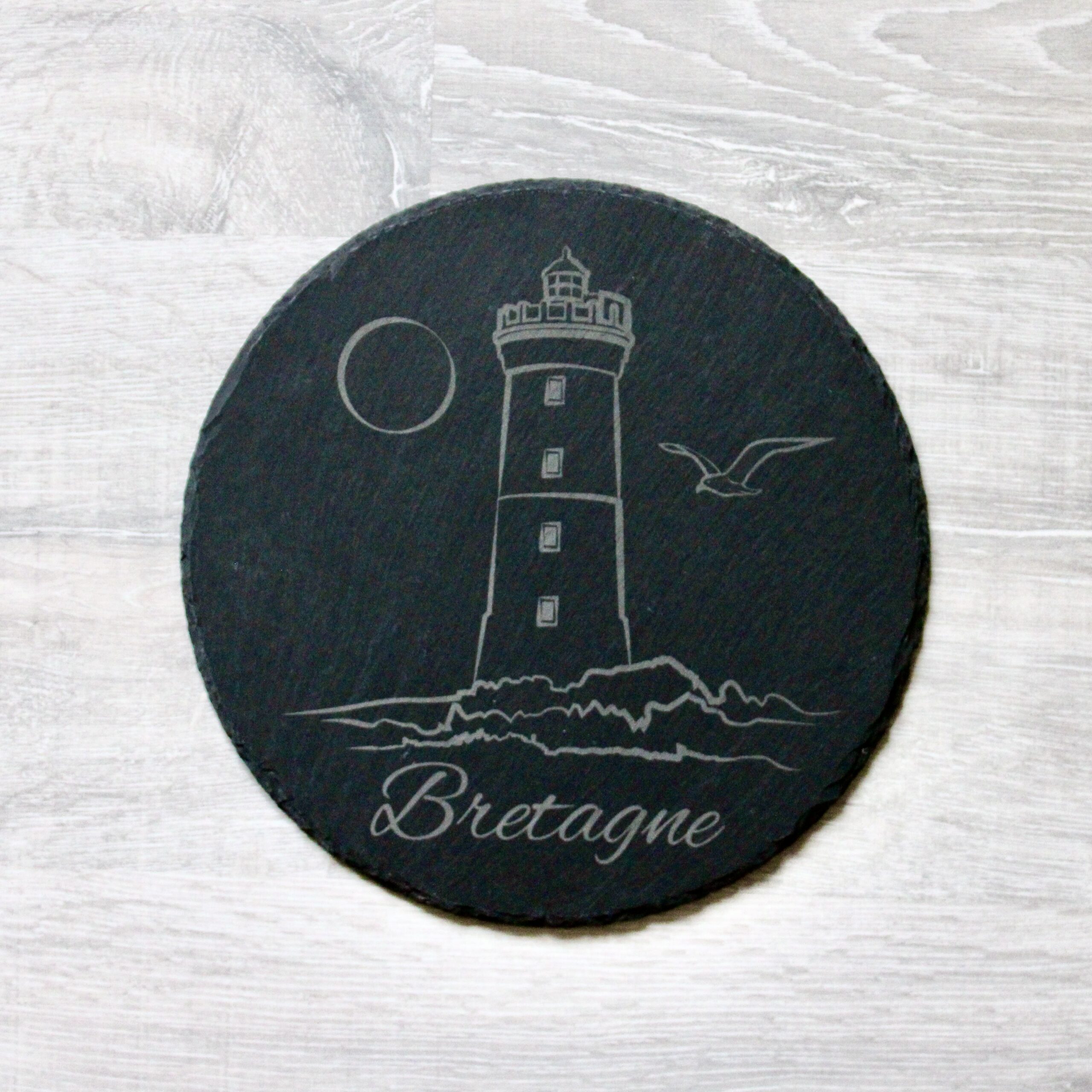 Ardoise de 20 cm de diamètre, gravée sur le thème de la Bretagne. Phare