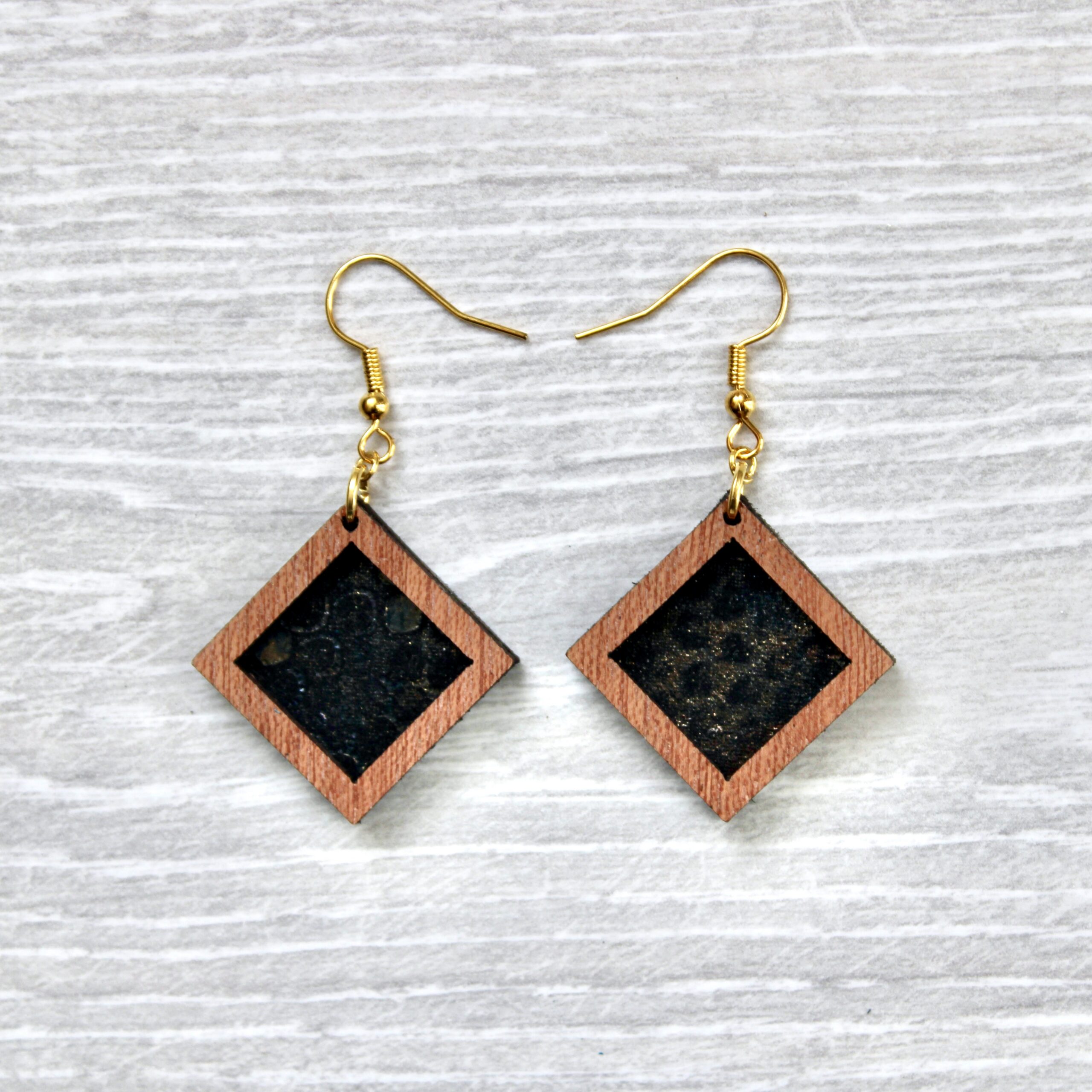 Boucles d’oreilles LOSANGE AVEC FOND (Sapelli, cuir « daim » serpent noir et doré)