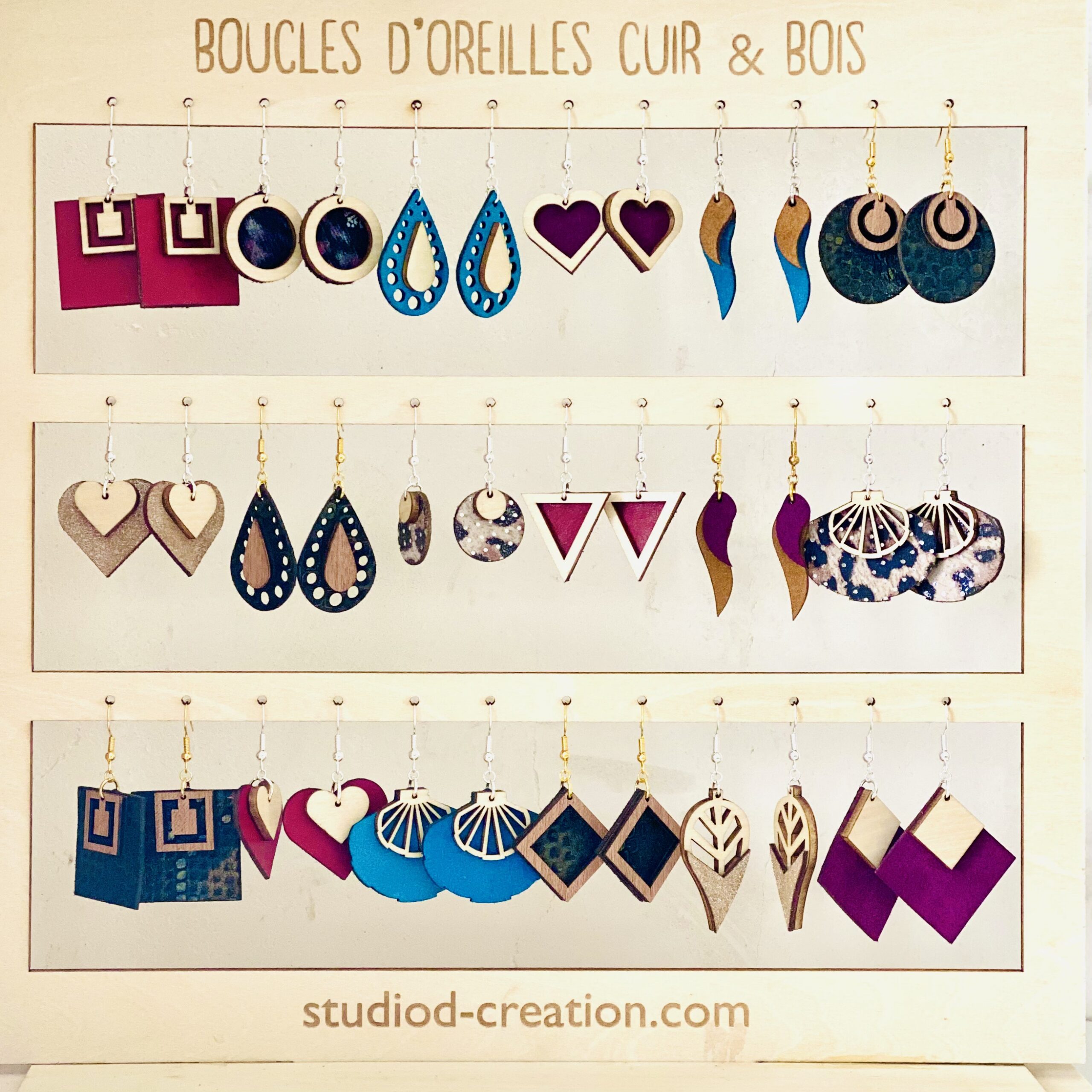 Toutes les boucles d'oreilles sont dessinées et créées par Delphine. Nos boucles sont en bois et en cuir. Chaque pièce peut présenter des caractéristiques différentes.