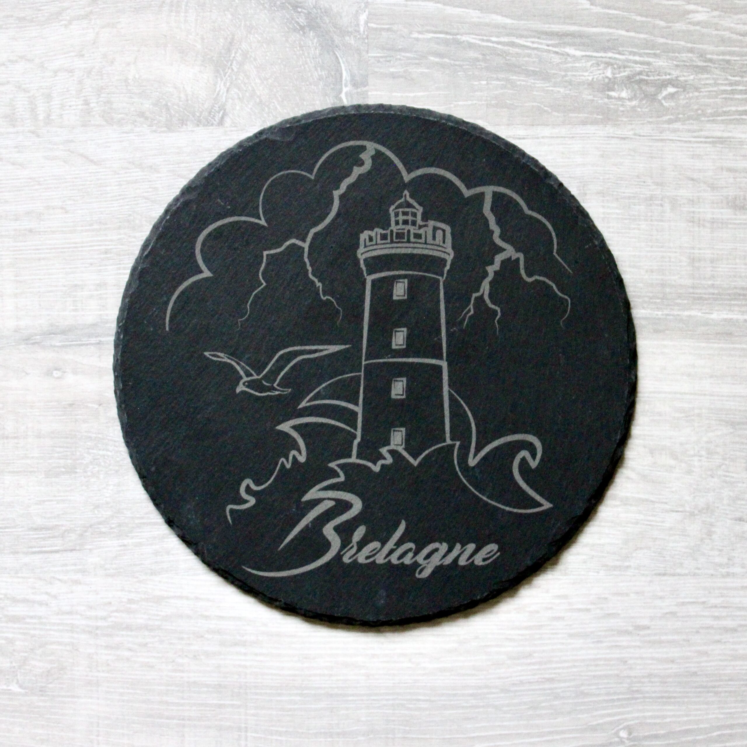 Ardoise de 20 cm de diamètre, gravée sur le thème de la Bretagne. Phare avec orage
